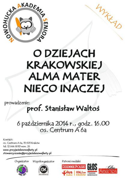 W poniedziałek 6 października br. o godz. 16:00 zapraszamy wszystkich słuchaczy na inaugurację piątego już roku akademickiego Nowohuckiej Akademii Seniora (os. Centrum A 6a)! Wykład inauguracyjny O dziejach krakowskiej Alma Mater nieco inaczej wygłosi prof. dr hab. Stanisław Waltoś – długoletni dyrektor Muzeum Uniwersytetu Jagiellońskiego w Collegium Maius. W programie także rozdanie nowych indeksów dla każdego z zapisanych studentów. Organizatorami Nowohuckiej Akademii Seniora są Stowarzyszenie Przyjaciół Nowej Huty oraz Ośrodek Kultury Kraków-Nowa Huta.