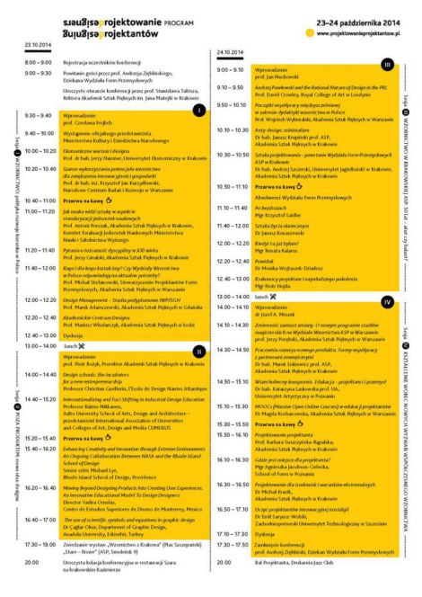 W trakcie dwudniowej konferencji głos zabiorą przedstawiciele władz, instytucji związanych z designem, stowarzyszeń projektantów, a przede wszystkim różnego typu szkół projektowych. Celem będzie wymiana doświadczeń w zakresie kształcenia na polu designu, określenie kierunku przyszłych zmian i sposobów ich wdrażania. W ramach „Projektowania Projektantów” odbędzie się blisko trzydzieści wykładów podzielonych na cztery sesje: „Wzornictwo: polityka rozwoju kierunku w Polsce”, „Poza produktem: nowe idee designu”, „Wzornictwo w krakowskiej ASP: 50 lat - atut czy balast?” oraz „Kształcenie wobec nowych wyzwań współczesnego wzornictwa”. Wykładom będą towarzyszyć dyskusje. Wśród wykładowców znaleźli się naukowcy z prestiżowych zagranicznych uczelni: L’Ecole de Design Nantes Atlantique (Nantes, Francja), Aalto University School of Arts (Helsinki, Finlandia), Rhode Island School of Design (Providence, Stany Zjednoczone), Centro de Estudios Superiores de Diseno de Monterrey (Santa Catarina, Meksyk), Anadolu University (Eskisehir, Turcja), Royal College of Art w (Londyn, Wielka Brytania), a także przedstawiciele polskich szkół wyższych z Warszawy, Łodzi, Krakowa, Gdańska, Poznania i Szczecina.