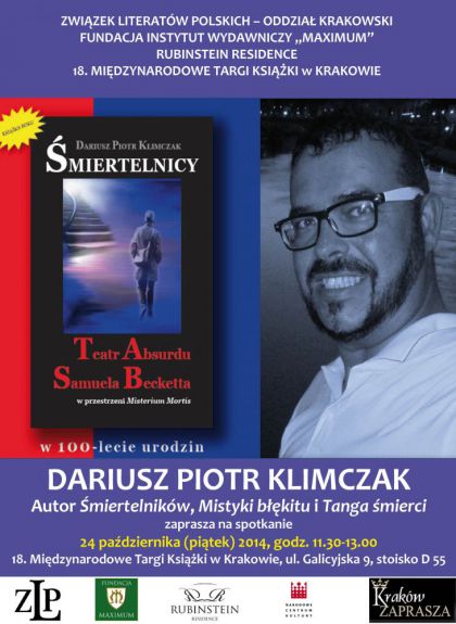 Zapraszamy na wyjątkowe spotkanie z dramologiem i absurdologiem DARIUSZEM PIOTREM KLIMCZAKIEM, autorem Śmiertelników, Mistyki błękitu i Tanga śmierci (Trylogii Tanatycznej Teatru Absurdu) wydanej pod auspicjami Narodowego Centrum Kultury