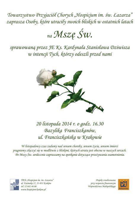 Towarzystwo Przyjaciół Chorych „Hospicjum im. św. Łazarza" zaprasza Osoby, które utraciły swoich bliskich w ostatnich latach
