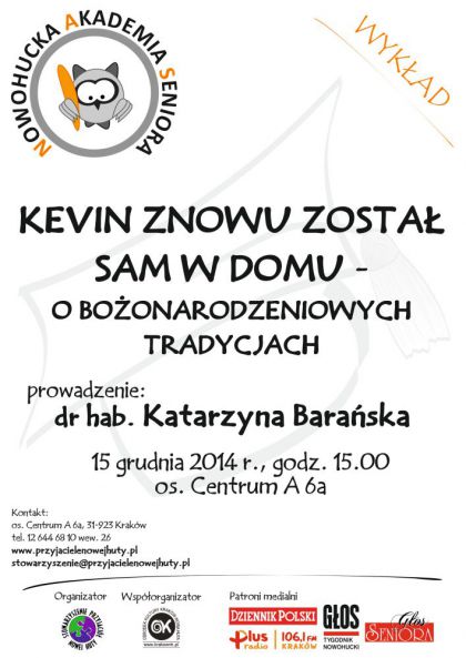 Kolejny z cyklu wykładów w Nowohuckiej Akademii Seniora będzie tym razem poświęcony tradycjom bożonarodzeniowym w kontekście współczesnym. Wykład poprowadzi dr. hab. Katarzyna Barańska - etnograf, antropolog i menedżer kultury, prezes oddziału krakowskiego Polskiego Towarzystwa Ludoznawczego, pracownik Instytutu Kultury UJ, była wicedyrektor Muzeum Etnograficznego im. S. Udzieli w Krakowie, współpracownik Muzeum Zamku w Niedzicy.