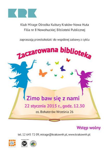 Klub Mirage Ośrodka Kultury Kraków-Nowa Huta zaprasza na zajęcia edukacyjno-relaksacyjne z elementami dramy i ćwiczeń oddechowych dla dzieci w wieku przedszkolnym w ramach cyklu Zaczarowana biblioteka. W tym miesiącu dzieci razem z bohaterami książek przekonają się, że zima wcale nie jest taka zła, a zimowe szaleństwo może się udzielić każdemu. Współorganizatorem cyklu jest Filia nr 8 Nowohuckiej Biblioteki Publicznej.