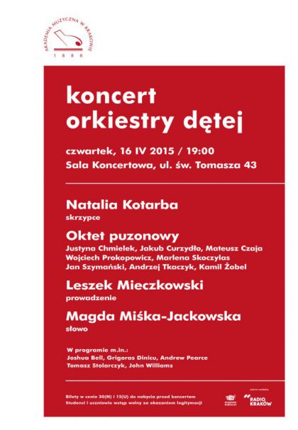 W czwartek 16 kwietnia o godzinie 19:00 na scenie Sali koncertowej przy ul. św. Tomasza 43 wystąpi Orkiestra Dęta Akademii Muzycznej w Krakowie wraz z solistką-skrzypaczką, absolwentką naszej Uczelni Natalią Kotarbą oraz Oktetem Puzonowym w składzie: Justyna Chmielek, Jakub Curzydło, Mateusz Czaja, Wojciech Prokopowicz, Marlena Skoczylas, Jan Szymański, Andrzej Tkaczyk, Kamil Żobel. Całość poprowadzi dyrygent Leszek Mieczkowski, a w programie znajdą się aranżacje muzyki filmowej. Do koncertu wprowadzi nas profesjonalnym słowem Magda Miśka-Jackowska – dziennikarka i prezenterka radiowa, prowadząca m.in. koncerty w ramach Festiwalu Muzyki Filmowej w Krakowie.
