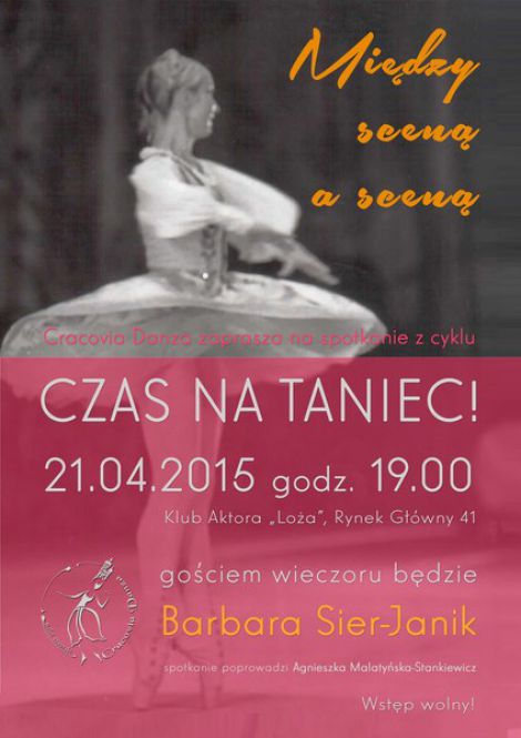 Barbara SIER-JANIK - tancerka i pedagog, przez wiele lat pierwsza solistka Baletu Teatru Wielkiego w Warszawie, wieloletnia nauczycielka tańca w warszawskiej Państwowej Szkole Baletowej, wykładowca tańca klasycznego i nowoczesnego w Akademii Muzycznej w Warszawie, a od 2007 roku wykładowca tańca klasycznego na Wydziale Teatru Tańca PWST w Krakowie, oddział w Bytomiu – będzie gościem kolejnego spotkania z przygotowywanego przez Balet Dworski Cracovia Danza cyklu CZAS NA TANIEC!. Spotkanie zatytułowane Między sceną a sceną odbędzie się we wtorek, 21 kwietnia, o godz. 19, w Klubie Aktora „Loża”. Kraków, Rynek Główny 41.