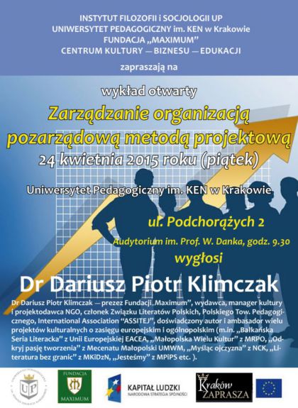 Dr Dariusz Piotr Klimczak - prezez Fundacji„Maximum”, wydawca, manager kultury i projektodawca NGO, członek Związku Literatów Polskich, Polskiego Tow. Pedagogicznego, International Association “ASSITEJ”, doświadczony autor i ambasador wielu projektów kulturalnych o zasięgu europejskim i ogólnopolskim (m.in. „Bałkańska Seria Literacka” z Unii Europejskiej EACEA, „Małopolska Wielu Kultur” z MRPO, „Odkryj pasję tworzenia” z Mecenatu Małopolski UMWM, „Myśląc ojczyzna” z NCK, „Literatura bez granic” z MKiDzN, „Jesteśmy” z MPiPS etc. ).