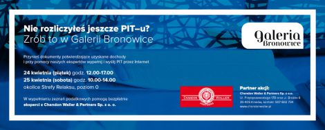 Rozliczanie PIT-ów odbędzie się w piątek 24 kwietnia w godz. 12-17.00 oraz w sobotę 25 kwietnia w godz. 10-14.00 na parterze Galerii Bronowice – naprzeciw Strefy Relaksu. Pomoc w wypełnianiu PIT-ów jest bezpłatna, nie są też prowadzone wcześniejsze zapisy.