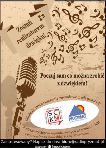 Uczestnicy zajęć zdobywają wiedzę na temat realizacji audycji radiowych, obróbki materiałów dźwiękowych i podstaw prawnych licencji CC. Najcenniejszą pierwszą praktykę w zawodzie realizator dźwięku zdobywają w internetowym radiu Pryzmat. Tutaj podczas codziennych audycji prowadzonych przez młodych adeptów sztuki dziennikarskiej, pracują realizatorzy dźwięku, którzy czuwają nad jakością techniczną emitowanych audycji. Uczestnicy zajęć dowiedzą się jak pracować podczas spektaklu teatralnego i jak odpowiednio nagłośnić muzyków podczas organizowanej Muzycznej Scenie Młodych, a także będą uczyć się pracy realizatora dzięki współpracy z Krakowską Scenę Muzyczną, ktróra organizuje koncerty muzyczne.