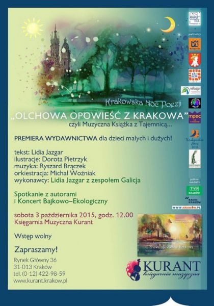 Uroczysta premiera wydawnictwa, czyli Spotkanie z twórcami i Bajkowo-Ekologiczny Koncert Lidii Jazgar z zespołem Galicja - sobota, 3 października 2015, w ramach kolejnej edycji Krakowskiej Nocy Poezji, ale w samo południe.