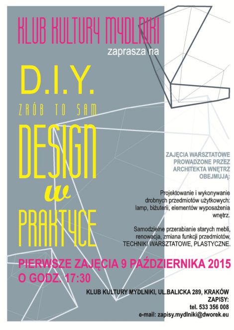 Jeżeli marzy Ci się projektowanie i wykonywanie drobnych przedmiotów, którymi odmienisz swoje mieszkanie lub uszczęśliwisz swoich najbliższych to przyjdź na warsztaty D.I.Y – zrób to sam, czyli design w praktyce. Nauczysz się jak tworzyć biżuterię, elementy wyposażenia wnętrz, samodzielnie przerobisz stare meble i nadasz koloru przedmiotom bez „życia”.