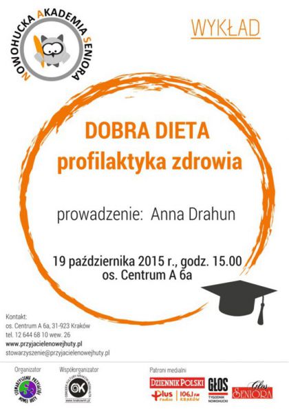 Nowohucka Akademia Seniora zaprasza na wykład dotyczący prawidłowego żywienia, szczególnie dla osób z nadciśnieniem, cukrzycą i chorobami nerek. Wykład poprowadzi Anna Drahun, Absolwentka Wydziału Technologii Żywności, na kierunku Technologii Żywności i Żywienia Człowieka, specjalizacja Dietetyki. Obecnie jest doktorantką Katedry Żywienia Człowieka UR w Krakowie. Dodatkowo ukończyła m.in. szkolenie podyplomowe w Instytucie Żywności i Żywienia w Warszawie „Poradnictwo dietetyczne - postępy w żywieniu człowieka” oraz kurs „Dietetyki Sportowej" organizowany przez NutriCenter w Krakowie.