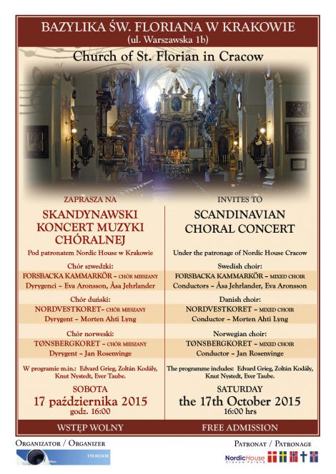 W sobotę, 17 października 2015, o godz.16:00 odbędzie się koncert trzech chórów mieszanych ze Skandynawii, w Bazylice Św. Floriana, w Krakowie, ul. Warszawska 1b.