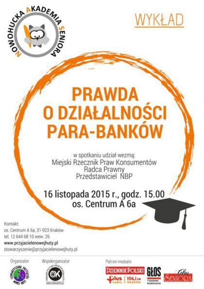 Nowohucka Akademia Seniora zaprasza 16 listopada o godz. 15.00 (os. Centrum A 6a) do udziału w debacie dotyczącej działalności para-banków, którą poprowadzą zaproszeni goście z Fundacji Instytut Łukasiewicza. W dyskusji wezmą udział Miejski Rzecznik Praw Konsumenta, Radca Prawny oraz przedstawiciel Narodowego Banku Polskiego. Seniorzy będą mogli zadać nurtujące ich pytania, dotyczące korzystania z oferty kredytowej para-banków. Zapraszają: Stowarzyszenie Przyjaciół Nowej Huty oraz Ośrodek Kultury Kraków-Nowa Huta.