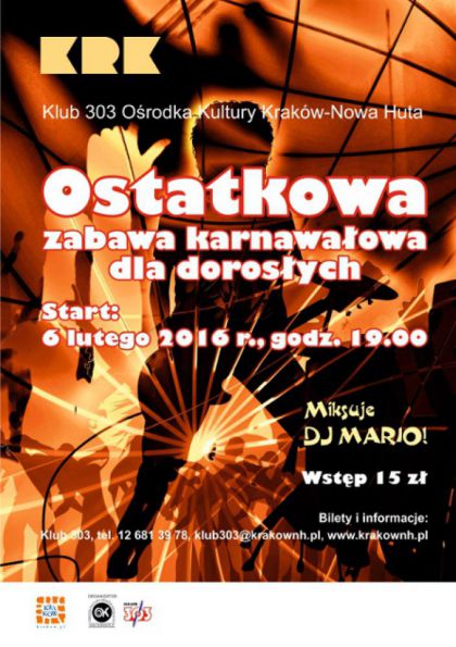 Klub 303 Ośrodka Kultury Kraków-Nowa Huta (os. Dywizjonu 303 nr 1) zaprasza 6 lutego na godz. 19.00 na tradycyjną zabawę dla dorosłych na zakończenie karnawału przy muzyce elektronicznej. Zabawa prowadzona przez DJ Mario gwarantuje wysoki poziom rozrywki, pełnej humoru i karnawałowej energii. Zapraszamy serdecznie.