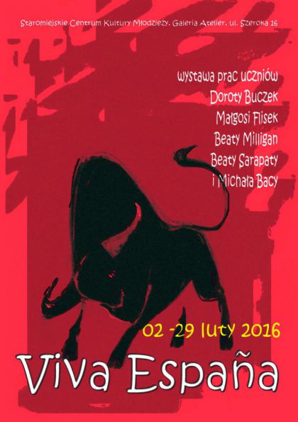 Zapraszamy na wernisaż wystawy prezentującej prace uczestników zajęć plastycznych prowadzonych pod kierunkiem Beaty Milligan, Doroty Kozłowskiej-Buczek, Beaty Sarapaty, Małgorzaty Flisek i Michała Bacy w Staromiejskim Centrum Kultury Młodzieży w Krakowie. Tematem przewodnim wystawy są inspiracje sztuką Hiszpanii i hiszpańskich artystów takich jak: Diego Velazquez, Francisco Goya, Pablo Picasso, Salvador Dali i inni.