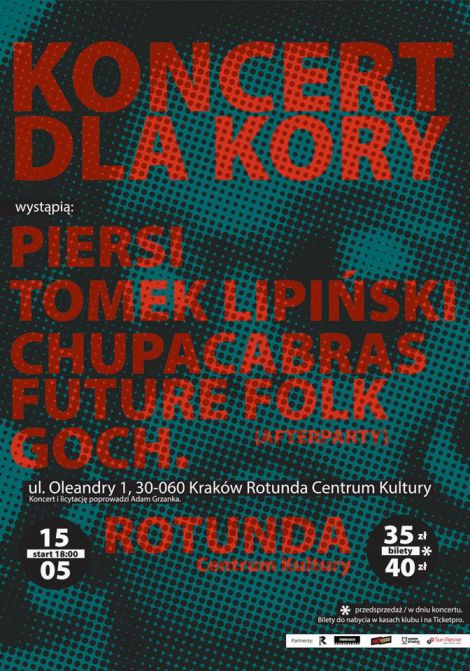 15 maja 2016 w krakowskiej Rotundzie odbędzie się koncert będący wyrazem wsparcia dla Olgi "Kory" Jackowskiej oraz wszystkich kobiet zmagających się z rakiem. Zagrają: Piersi, Tomek Lipinski, Chupacabras, Future Folk i zespół Goch. Koncert i licytacje (m.in. obraz autorstwa Kory), poprowadzi Adam Grzanka - Będzie się działo! CAŁKOWITY DOCHÓD zostanie przekazany na rzecz fundacji Alivia ( https://www.facebook.com/FundacjaAlivia/ ). Liczymy zatem na WASZ liczny udział !!! Bilety w cenie: przedprzedaż 35,-pln, w dniu koncertu 40,-pln.