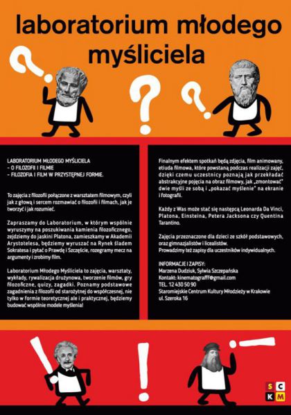 Zapraszamy do Laboratorium, w którym wspólnie wyruszymy na poszukiwania kamienia filozoficznego, zejdziemy do jaskini Platona, zamieszkamy w Akademii Arystotelesa, będziemy wyruszać na rynek śladem Sokratesa i pytać Prawdę i Szczęście, rozegramy mecz na argumenty,