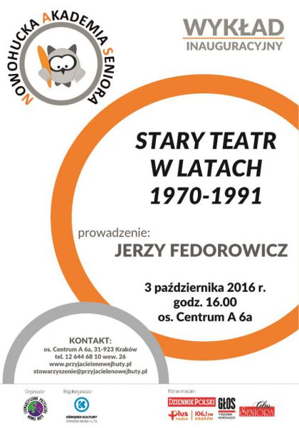 Nowohucka Akademia Seniora (os. Centrum A 6a) rozpocznie w październiku siódmy rok swojej działalności. Podczas inauguracji 3 października o godz. 16.00 zostaną wręczone indeksy nowym członkom Akademii a wykład inauguracyjny pt. Stary teatr w latach 1970-1991 wygłosi Jerzy Fedorowicz. Organizatorzy: Stowarzyszenie Przyjaciół Nowej Huty oraz Ośrodek Kultury Kraków-Nowa Huta serdecznie zapraszają wszystkich, którzy chcieliby poznać, czym jest Nowohucka Akademia Seniora.