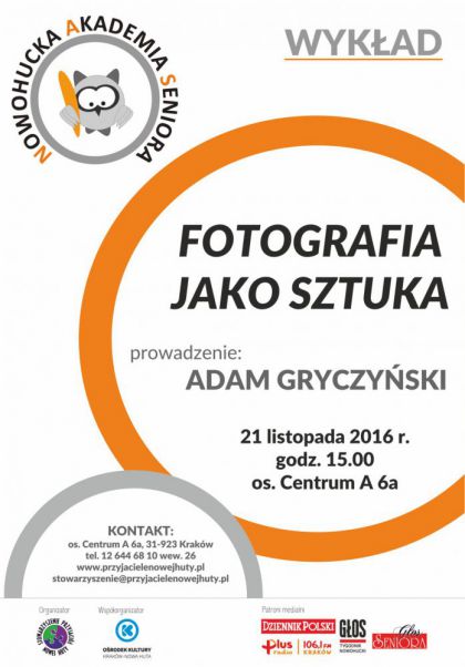 21 listopada o godz. 15.00 gościem Nowohuckiej Akademii Seniora (os. Centrum A 6a) będzie wybitny, nowohucki fotograf – Adam Gryczyński, członek Związku Polskich Artystów Fotografików. Podczas wykładu pt. Fotografia jako sztuka przybliży on słuchaczom dziedzinę fotografii artystycznej. Będzie można usłyszeć o różnorodnych nurtach w fotografii artystycznej, sposobach tworzenia i pojmowania fotografii jako sztuki, o zachwytach i oburzeniu na sztukę fotografii oraz o wartościach jakie niesie w sobie fotografia. Wykład będzie nawiązywał do początków historii fotografii, oczywiście będzie bogato ilustrowany zdjęciami polskich i światowych twórców. W drugiej części spotkania zostaną zaprezentowane fotografie prelegenta spotkania – Adama Gryczyńskiego. W obszarze jego szczególnych zainteresowań znajduje się człowiek, krajobraz, ginąca architektura oraz fotografia kreacyjna, w tym opracowania komputerowe ukazujące poprzez metaforę fenomeny współczesnej egzystencji.