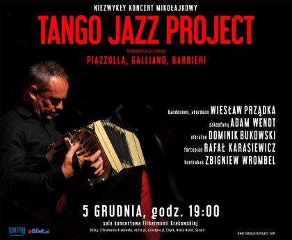 TANGO JAZZ PROJECT - to połączenie dwóch światów muzycznych TANGA I JAZZU z udziałem POLSKICH GWIAZD muzyki jazzowej: ADAMA WENDTA - saksofon tenorowy i sopranowy, DOMINIKA BUKOWSKIEGO - wibrafon, ZBIGNIEWA WROMBELA - kontrabas, RAFAŁ KARASIEWICZA - fortepian i WIESŁAW PRZĄDKA - bandoneon, akordeon.