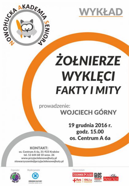 Tematem kolejnego wykładu w Nowohuckiej Akademii Seniora (os. Centrum A 6a) będą Żołnierze wyklęci – fakty i mity. Prowadzący wykład – Wojciech Górny, pracownik Muzeum Historycznego Miasta Krakowa, wprowadzi słuchaczy w temat założeń działalności konspiracyjnej, organizacji i największych bitew powojennego podziemia. Wykład dotyczyć będzie także propagandy komunistycznej w czasach PRL-u i represji oraz mitów i sporów, które narosły wokół tematu Żołnierzy wyklętych po 1989 r. Organizatorzy: Stowarzyszenie Przyjaciół Nowej Huty oraz Ośrodek Kultury Kraków-Nowa Huta zapraszają 19 grudnia o godz. 15.00.