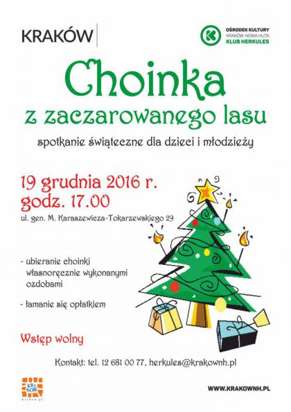 Klub Herkules Ośrodka Kultury Kraków-Nowa Huta (ul. Gen. M. Karaszewicza-Tokarzewskiego 29) zaprasza na spotkanie pt. choinka z zaczarowanego lasu w poniedziałek 19 grudnia na godz. 17.30. Czy wiecie, skąd wziął się zwyczaj ubierania choinki? Jaka jest historia tej najpopularniejszej ozdoby świątecznej? Podczas spotkania w Klubie Herkules poznacie odpowiedzi na te wszystkie pytania. Uczestnicy wykonają także własnoręcznie ozdoby, którymi potem wspólnie udekorują choinkę. Klub zaprasza wszystkie dzieci do wspólnej zabawy.
