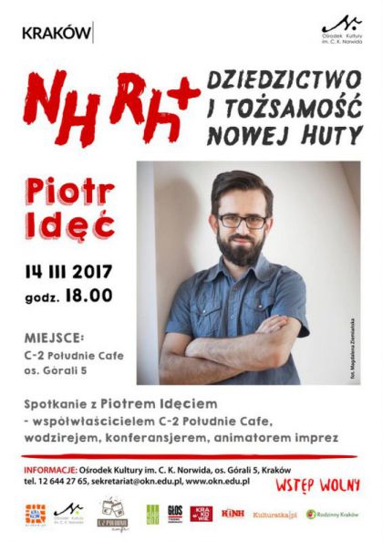 Spotkanie z Piotrem Idęciem - współwłaścicielem C-2 Południe Cafe, wodzirejem, konferansjerem, animatorem imprez. Spotkanie w ramach cyklu „NH Rh+ Dziedzictwo i tożsamość Nowej Huty”. Wstęp wolny.