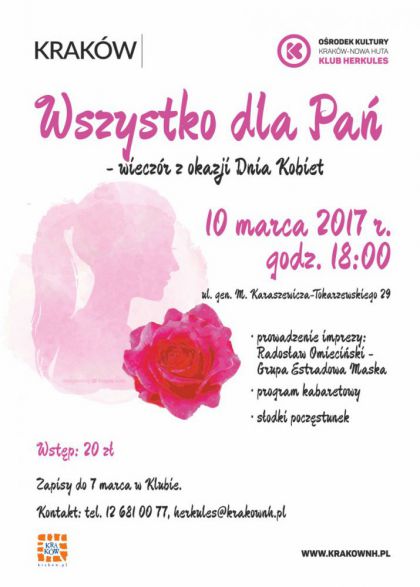 Każda kobieta jest piękna, kiedy czuje się szczęśliwa. Każda kobieta zasługuje na to, by nosić ją na rękach. Drogie Panie, zapomnijcie na chwilę o codziennych obowiązkach. Klub Herkules Ośrodka Kultury Kraków-Nowa Huta (ul. Gen. M. Karaszewicza-Tokarzewskiego 29) zaprasza na wyjątkowe spotkanie z okazji Dnia Kobiet. Wszystkie uczestniczki będą mogły spędzić miło czas, bawiąc się podczas programu kabaretowego w wykonaniu Radosława Omiecińskiego. Informacje i zapisy w godzinach otwarcia Klubu do 7 marca.