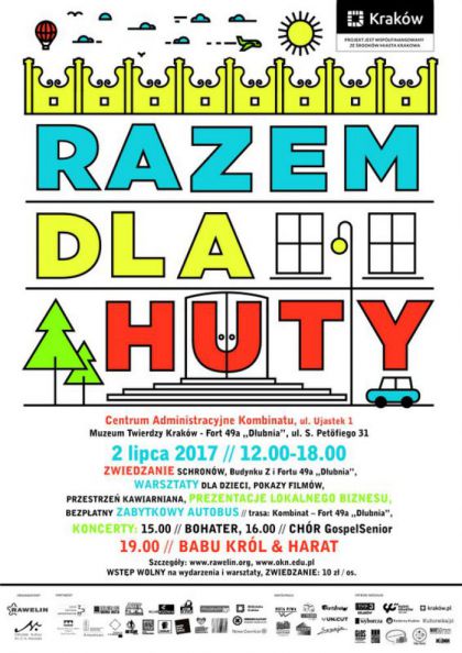 Już po raz drugi Małopolskie Stowarzyszenie Miłośników Historii „Rawelin” oraz Ośrodek Kultury im. C. K. Norwida wspólnie z innymi nowohuckimi instytucjami kultury, organizacjami pozarządowymi, grupami nieformalnymi i lokalnym biznesem organizują wydarzenie Razem dla Huty. 2 lipca 2017 r. w Centrum Administracyjnym Kombinatu (ul. Ujastek 1) oraz w Muzeum Twierdzy Kraków – Forcie 49a „Dłubnia” (ul. Petöfiego 31) przygotowano moc atrakcji dla dużych i małych! Start o godz. 12.00.