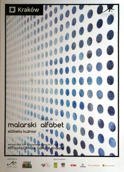 Malarski alfabet - to tytuł wystawy i instalacji malarskiej, która jest pewnego rodzaju formą subiektywnego alfabetu, wyrażonego symboliką wartości kształtu i koloru. Instalacja została zobrazowana za pomocą zmultiplikowanego, ustrukturyzowanego kształtu koła, utrzymana w kolorystyce czerni, bieli, błękitu. Malarski alfabet to interpretacja biblijnego aktu Stworzenia, próba przełożenia niepoznawalnego na język materii – kształtu i koloru, inspirowanych światłością i ciemnością.