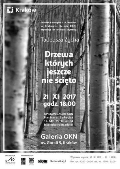 Ośrodek Kultury im. C. K. Norwida zaprasza na wernisaż wystawy Tadeusza Zycha pt. "Drzewa, których jeszcze nie ścięto". Wystawę będzie można oglądać w Ośrodku Kultury im. C. K. Norwida do końca roku 2017 r. Wstęp wolny.