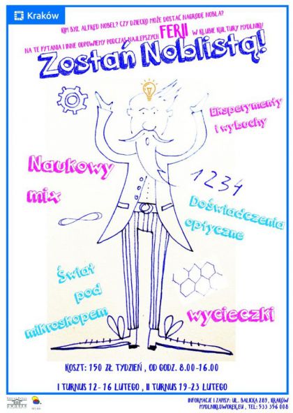Jak zostać Noblistą? To pytanie nurtuje niejednego młodego naukowca! Podczas zimowych ferii w Klubie Kultury Mydlniki podzielimy się z waszymi pociechami tą wiedzą! I nie tylko! Dzieci będą miały również możliwość zostania Noblistami w nowych, wyjątkowych kategoriach! Przed nami dwa tygodnie wspaniałej zabawy, będzie dużo eksperymentów i doświadczeń, dzięki którym najmłodsi lepiej poznają otaczający nas świat, a zdobyte umiejętności i wiedzę nieraz wykorzystają w praktyce. UWAGA: garść sprawdzonych pomysłów zostanie przedstawiona w prawdziwym laboratorium! Ciekawostki i najważniejsze informacje o noblistach z całego świata pozwolą poznać dzieciom wiele zagadnień z dziedzin takich jak chemia, fizyka, medycyna oraz literatura. A to wszystko w formie zabaw, gier, warsztatów plastycznych i chemicznych oraz wizyt w ciekawych miejscach.