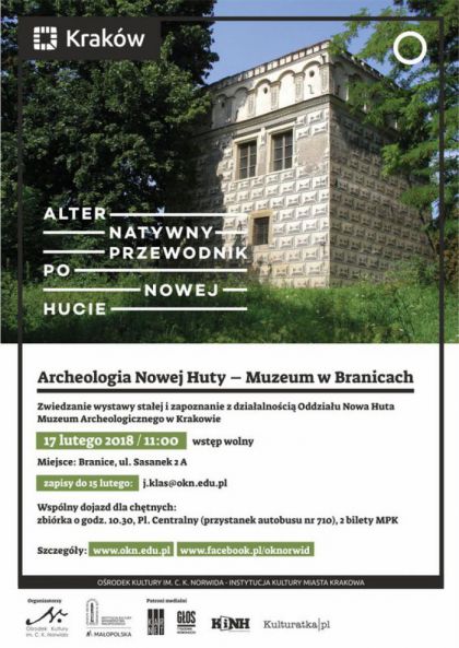 Podczas wizyty w Branicach, które są gniazdem rodowym Gryfitów-Branickich, zwiedzimy stałą ekspozycję archeologiczną, a także zapoznamy się z dziejami archeologii na terenach obecnej Nowej Huty. Zobaczymy tzw. „lamus”, czyli późnorenesansowy dwór obronno-mieszkalny z bogato zdobionym kominkiem oraz portalem drzwiowym warsztatu Santi Gucciego, a także klasycystyczny dwór z przełomu XVIII i XIX w. wzniesiony dla rodziny Badenich.