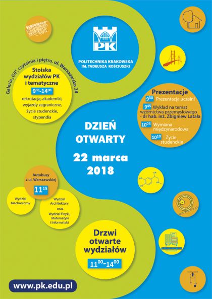 Serdecznie zapraszamy na Dzień Otwarty na Politechnice Krakowskiej! Jesteś zainteresowana/zainteresowany studiami na PK? Przyjdź do nas w czwartek 22 marca i zobacz, jak studiuje się na jednej z najlepszych uczelni technicznych w Polsce! Co dla Was przygotowaliśmy w tym dniu? Same interesujące rzeczy, m.in.: zwiedzanie wydziałów i laboratoriów, stoiska tematyczne oraz prezentacje.