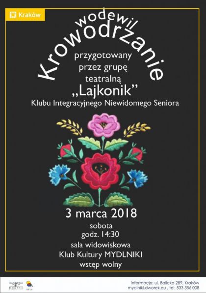 Stowarzyszenie "Lajkonik" oraz Klub Kultury Mydlniki serdecznie zapraszają wszystkich miłośników komedii, farsy i groteski na wodewil "Krowodrzanie" w wykonaniu grupy teatralnej Klubu Integracyjnego Niewidomego Seniora.