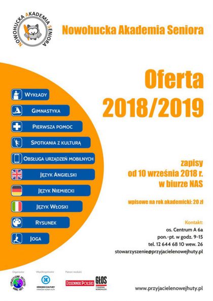 Od 10 września ruszają zapisy do Nowohuckiej Akademii Seniora (os. Centrum A 6a )na rok akademicki 2018/19. Zapisy, wyłącznie osobiste, przyjmowane są od poniedziałku do piątku, w godz. 9.00-15.00 na os. Centrum A 6a. Warunkiem uczestnictwa w zajęciach NAS jest wypełnienie deklaracji i opłacenie jednorazowego wpisowego.