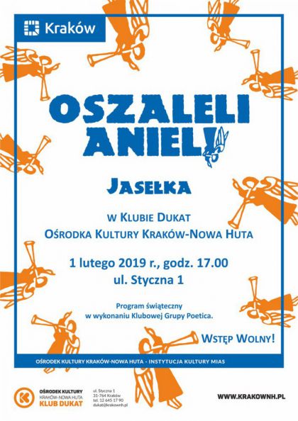 Klub Dukat Ośrodka Kultury Kraków-Nowa Huta (ul. Styczna 1) zaprasza 1 lutego o godz. 17.00 na jasełka. Czy aniołom zdarza się oszaleć i co z tego może wyniknąć? Czy pasterze mogą się lenić, a do tego spierać z królami? Kto podsuwa złe pomysły Herodowi? Odpowiedzi na te pytania poznają widzowie widowiska „Oszaleli Anieli”. Coroczny jasełkowy występ Klubowej Grupy Poetica stanowi dobrą tradycję Klubu Dukat, a na jej straży stoją okoliczni mieszkańcy. W tegorocznej edycji, wieńczącej okres bożonarodzeniowy, wystąpi 14 osób, a w obsadzie aktorskiej nie zabraknie niespodzianek. Brawurowa akcja, żywa narracja i barwne stroje to od lat znak firmowy dukatowych jasełek, na które gorąco zapraszają organizatorzy i artyści.