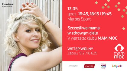 Każdy z nas wie, jak ważna jest codzienna aktywność. To nie tylko wzmocnienie ciała czy poprawa kondycji, ale również niezawodny zastrzyk endorfin i recepta na zdrowie. Jednak aby móc cieszyć się zdrowym ciałem jak najdłużej, trzeba dostosować formę treningu do swoich predyspozycji i możliwości. O to jak dbać o siebie na co dzień, opowie uczestniczkom warsztatów „Szczęśliwa mama w zdrowym ciele” Paulina Holtz. Warsztaty odbędą się 13 maja w salonie Martes Sport w Centrum Serenada w trzech turach: o 16.45, 18.15 oraz 19.45.