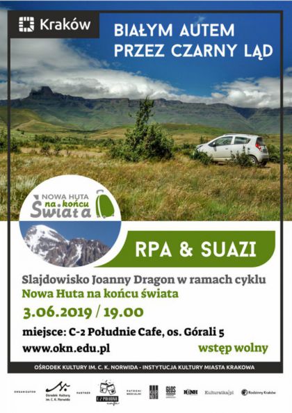 Tym razem przeniesiemy się na samo południe Afryki. O swojej trzytygodniowej podróży po RPA i Królestwie Suazi opowie Joanna Dragon. Oprócz obejrzenia cudownych zdjęć i filmików, będzie można posłuchać wielu ciekawych historii m.in. o bliskich spotkaniach na drodze ze słoniami i nosorożcami, problemach kierowców w Suazi, noclegach "na dziko", gdzie odbywa się i z czym jest związany taniec dziewic, co można zobaczyć w Parku Narodowym Krugera oraz jak wygląda życie w tych krajach.