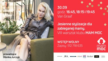 Chłody jesieni rozgrzewamy zapałem i kobiecą solidarnością! To znak, że spotkania z cyklu MAM MOC wracają do Centrum Serenada. Już 30 września odbędzie się ich kolejna odsłona. Z myślą o wszystkich mamach przygotowaliśmy warsztaty pt. „Jesienne stylizacje dla zabieganej mamy", które poprowadzi OSA – Osobista Stylistka. Warsztaty odbędą się w trzech grupach o 16.45, 18.15 oraz 19.45.