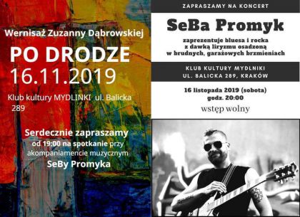 Klub Kultury Mydlniki zaprasza na wernisaż " Po drodze" artystki, Zuzanny Dąbrowskiej oraz koncert Seby Promyka. Baśniowe i magiczne obrazy w połączeniu z charyzmatycznym głosem wokalisty oraz liryczną narracją zaprowadzą Nas do świata odległych przygód, wrażeń i niezapomnianych emocji.
