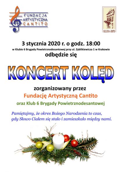 Już po raz piąty na scenie Klubu 6 Brygady Powietrznodesantowej w Krakowie 3 stycznia o godzinie 18.00 spotkają się wspaniali soliści, muzycy i przyjaciele z Fundacji Artystycznej Cantito. Jak co roku specjalnie przygotowany na tę okazję materiał muzyczny, składający się z pięknych polskich pastorałek i utworów świątecznych, wykona 10-osobowy zespół muzyczny, w skład którego wchodzą profesjonalni muzycy, jak i amatorzy pasjonaci, Wokaliści i instrumentaliści, osoby niewidome jak i pełnosprawne. Będą mogli państwo usłyszeć: fortepian, perkusję, gitarę basową oraz obój.