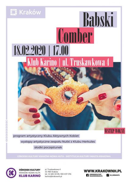 Po raz piąty Klub Karino zaprasza do udziału w Babskim Combrze - imprezie kultywującej lokalne obrzędy. Babski Comber odbywa się, co roku pod koniec karnawału, a jego tradycja sięga średniowiecza. Inscenizacja dawnych zwyczajów w wykonaniu Grupy Obrzędowej z Chałupek, kuglarski pokaz popularnych kobiecych zawodów, występ zespołów Nutki i Kościelanki oraz przygotowane specjalnie na tę okazję przez grupę Aktywnych Kobiet z Klubu Karino ciepłe pączki, faworki, karnawałowe róże i rogaliki, pozwolą hucznie i słodko podsumować karnawał. Wydarzenie poprowadzi Krzysztof Karolczyk, a to znak, że nie zabraknie zabaw i ciekawych konkursów.