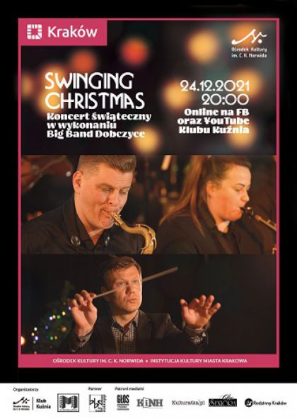 Zapraszamy na premierę online świątecznego koncertu pt. Swinging Christmas w wykonaniu Big Bandu Dobczyce - orkiestry, która uderza energią i zachwyca solówkami. W programie polskie kolędy i pastorałki, a także największe przeboje świąteczne, zarówno w wersjach instrumentalnych, jak i wokalnych.