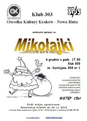 Klub 303 Ośrodka Kultury Kraków-Nowa Huta zaprasza na imprezę mikołajkową. W programie: wręczanie prezentów przez Mikołaja, występ teatrzyku Art-Re oraz możliwość zrobienia sobie pamiątkowego zdjęcia z przybyszem z Mikołajem.