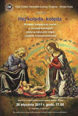 Jeszcze w blasku świątecznej choinki, w zimowej scenografii po raz kolejny w Klubie Dukat Ośrodka Kultury Kraków-Nowa Huta popłyną tradycyjne kolędy i piosenki bożonarodzeniowe. We wspólnym śpiewaniu pomoże prowadzący kolędowanie Janusz Rojek i przygotowany specjalny śpiewnik multimedialny. Na zmarzniętych gości czeka gorąca herbata i ciepła rodzinna atmosfera.