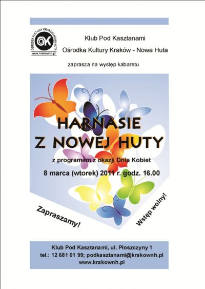 Klub Pod Kasztanami Ośrodka Kultury Kraków-Nowa Huta zaprasza na występ Kabaretu Harnasie z Nowej Huty z programem okolicznościowym z okazji Dnia Kobiet.