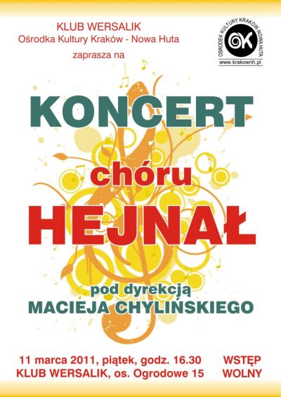 Klub Wersalik Ośrodka Kultury Kraków-Nowa Huta zaprasza na koncert Chóru Hejnał. W programie koncertu znajdą się utwory najwybitniejszych kompozytorów polskich i zagranicznych, t.j.: S. Moniuszko, J. Maklakiewicz, L. van Beethoven, F. Schubert, J. Brahms, J. Strauss, G. Verdi, W. A. Mozart.