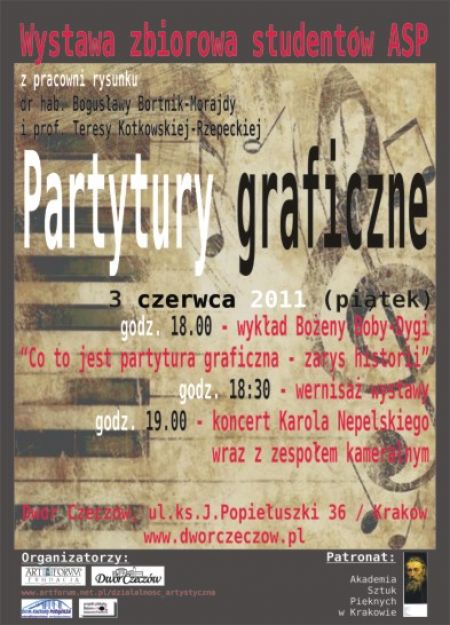 Już od 3 czerwca w krakowskim Dworze Czeczów będzie można obejrzeć wystawę prac powstałych podczas trwających od 14 do 16 marca. Warsztatów Partytur Graficznych na Akademii Sztuk Pięknych w Krakowie w pracowni rysunku dr hab. Bogusławy Bortnik-Morajdy i prof. Teresy Kotkowskiej-Rzepeckiej. Hasłami przewodnimi prac są : Muzyka zaklęta w obrazie, Muzykę można namalować i narysować!, Obraz można zagrać!, Muzyka zapisana graficznie może wyglądać pięknie!