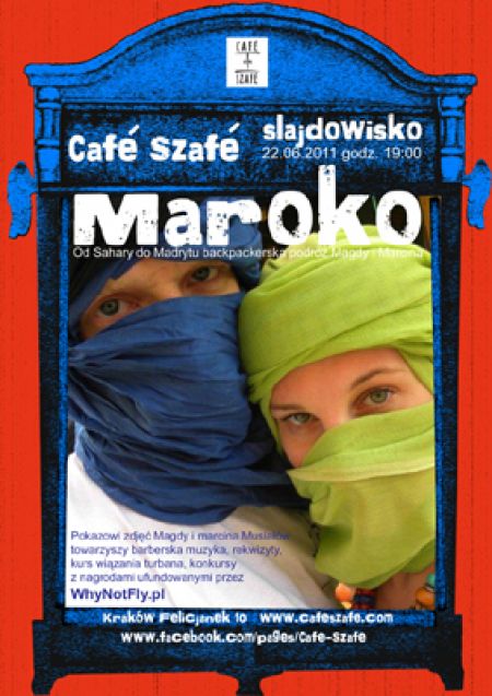 Podczas spotkania Magda i Marcin zaprezentują zdjęcia ze swojej wyprawy, a wydarzeniu temu towarzyszyć będzie berberska muzyka oraz marokańskie rekwizyty. Chętni będą mogli nauczyć się wiązać turban, powąchać marokańskie przyprawy i zanurzyć dłoń w piasku Sahary. Najbardziej aktywna część publiczności będzie miała dodatkowo okazję skosztować berberską whisky, z oryginalnego srebrnego naczynia zdobytego na suku w Marrakeszu. Podczas spotkania planowane są również upominki od partnerów wydarzenia: Centrum Nurkowego Nautica i portalu WWW.WhyNotFly.pl