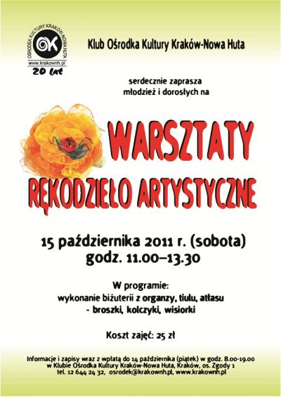 Klub Ośrodka Kultury Kraków – Nowa Huta (os. Zgody 1) zaprasza młodzież i dorosłych na warsztaty rękodzieła, które odbędą się 15 października (sobota) 2011 r. w godz. 11.00 – 13.30.